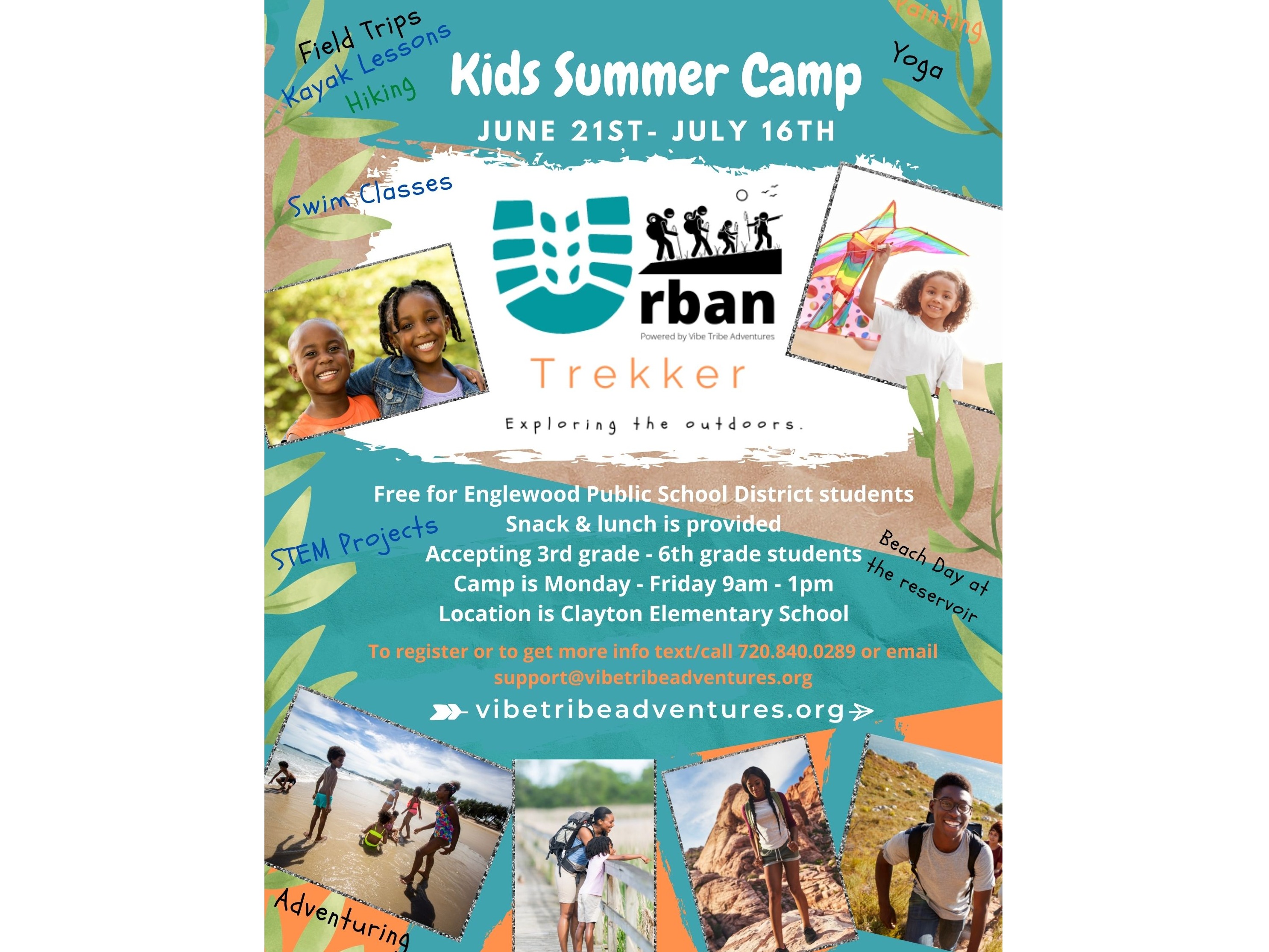 Clayton Elementary's 21st Century Community Learning Center is partnering with Vibe Tribe Adventures to host a new, exciting summer camp for Englewood Schools students in grades 3rd - 6th. Kids enrolled in Urban Trekker camp will get to go on many different field trips and participate in fun activities like hiking, kayaking, STEM projects, yoga, painting, swim classes, and a beach day!